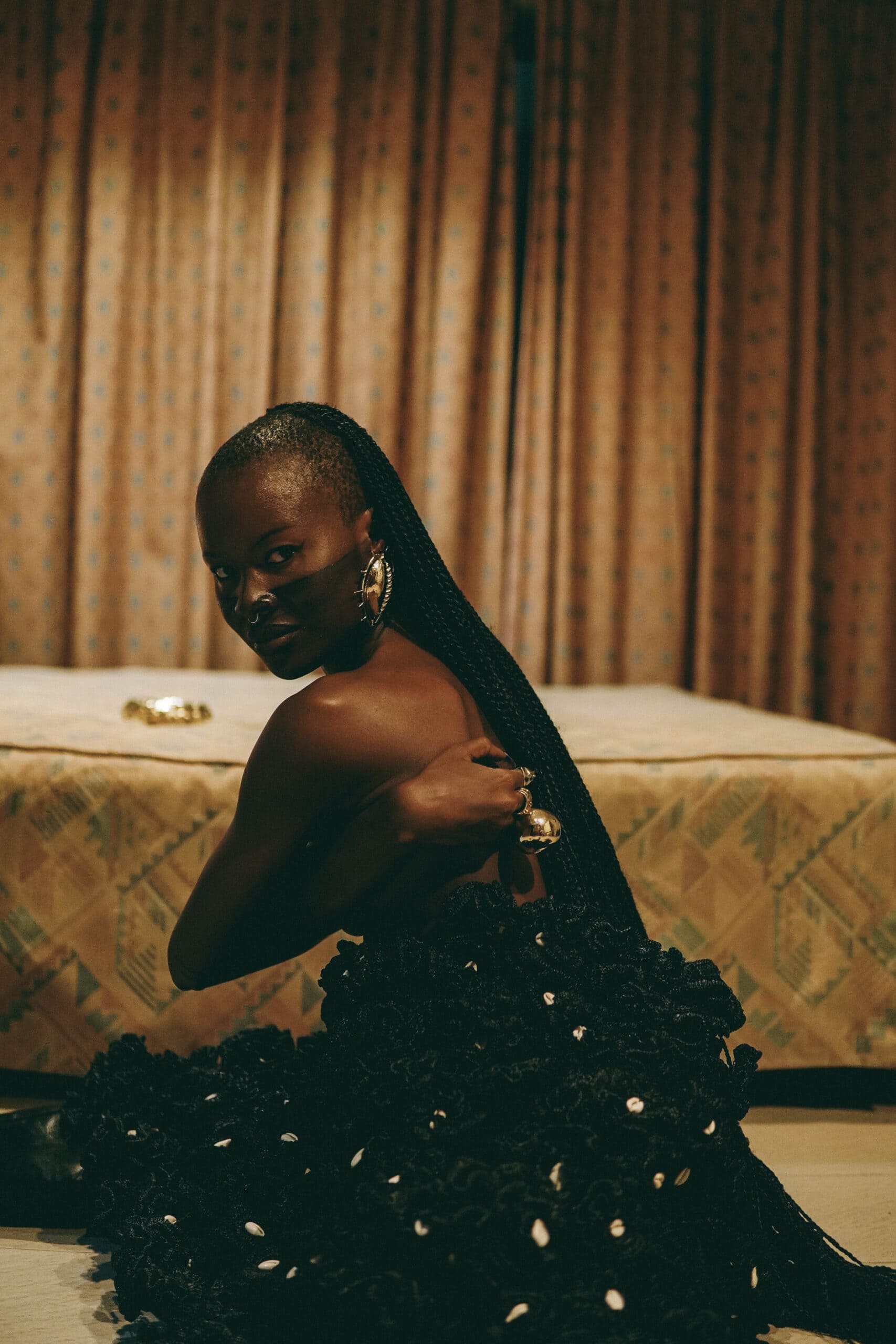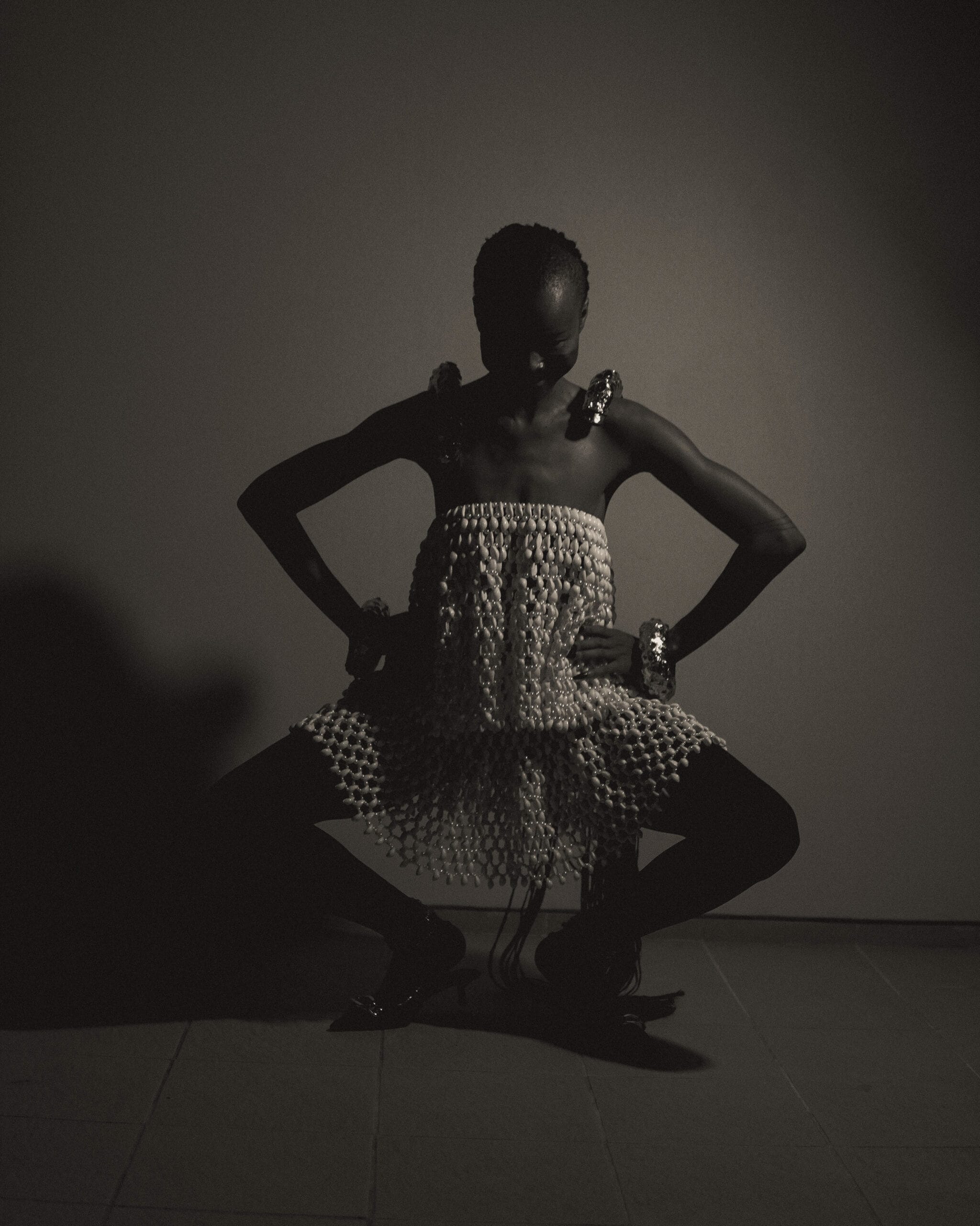 Born in Côte d’Ivoire, Lafalaise Dion, also known as The Queen of Cowries, is a visual artist, performer, and designer who embodies the essence of African heritage, mythology, and spirituality. Based in Abidjan, she draws inspiration for her clothing, jewellery, and art from the Dan culture in the Western region of Côte d’Ivoire — particularly cowrie shells, which are steeped in centuries of ancestral symbolism.