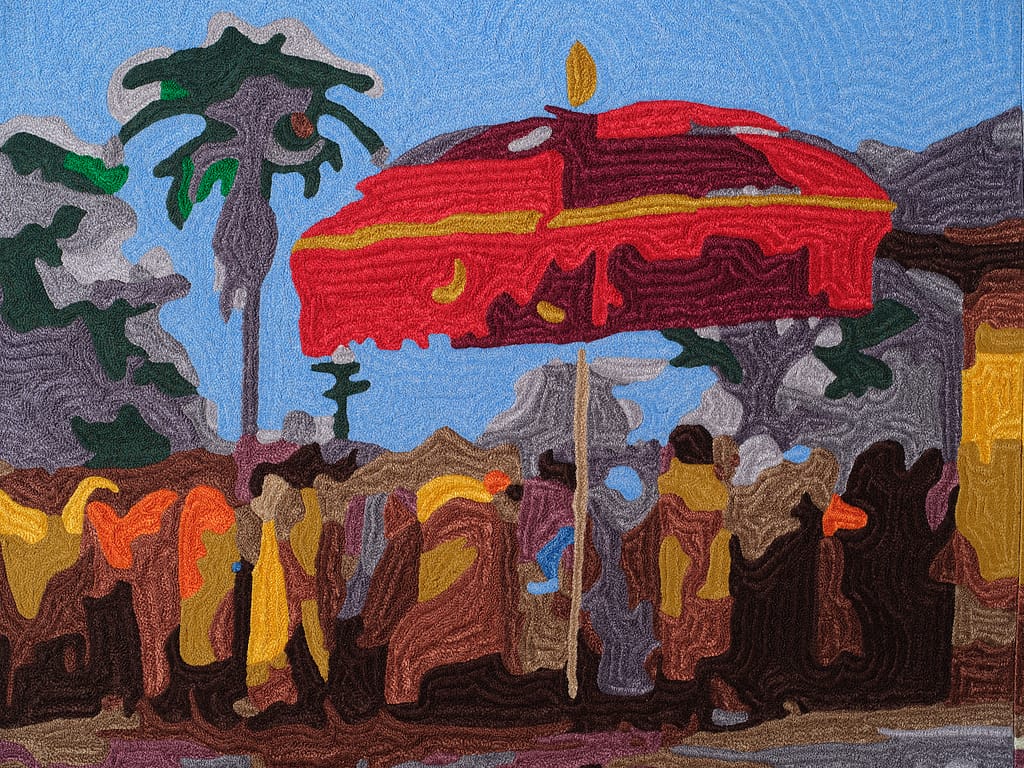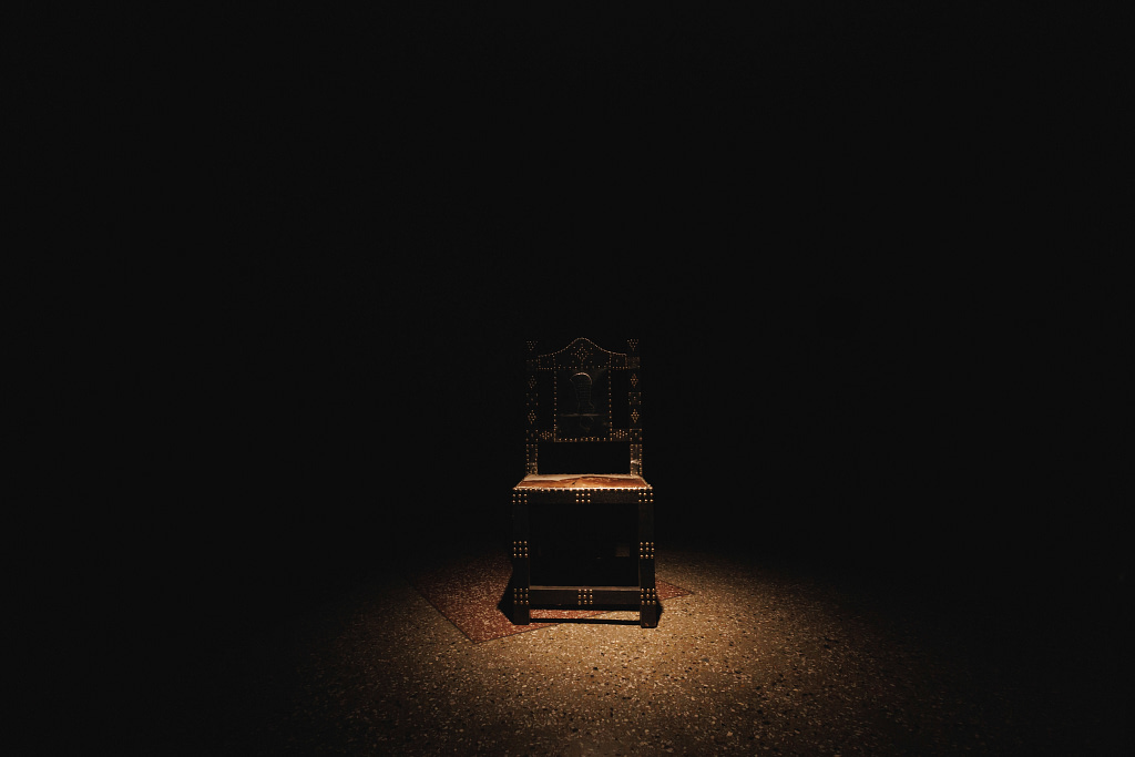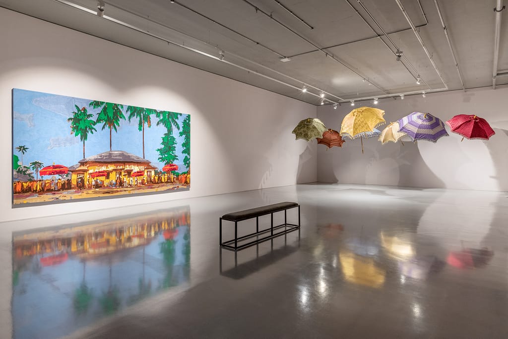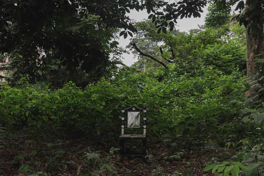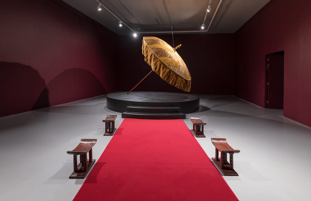 One of the key symbols of One Must Be Seated is the royal umbrella as it’s believed to transform the individual underneath it, attributing significant status. Different sizes, colours, and unique gold totems that crown the umbrella canopy are seen as they move with the court in a lively procession. Benissan reimagines these umbrellas in rich velvet, made by the same craftsmen who make the royal umbrellas for the palace in Kumasi, the Asante capital. By intentionally naming these artisans as collaborators, the artist honours the hands that uphold the traditions of the chieftaincy. The final golden throne at the end of the exhibition stands as a quiet yet commanding challenge: When the time comes, will you be ready to take your seat?